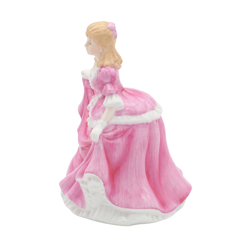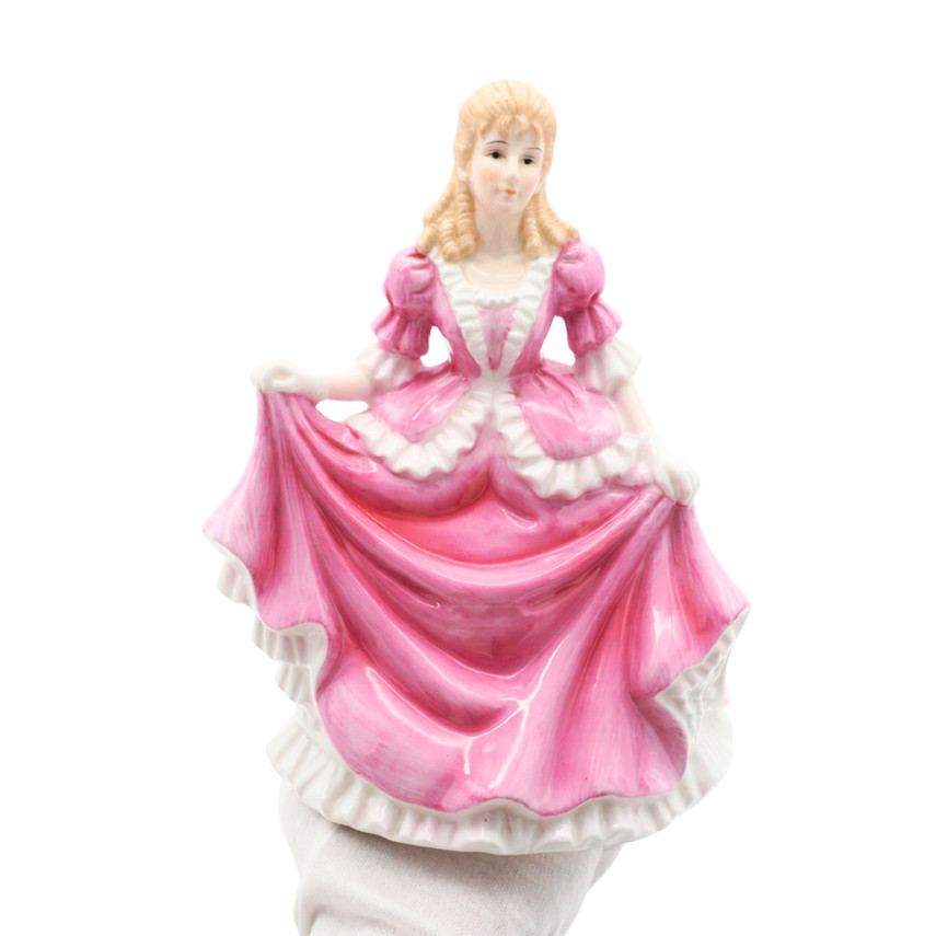 This Sara figurine from The Leonardo Collection depicts a young woman posed gracefully while holding the hem of her flowing pink gown. Crafted in fine porcelain, the figure features soft pastel coloring, delicate facial details, and a glossy finish that highlights the movement of the dress. The sculptural folds and gentle expression give the piece a classic, romantic charm. Marked on the base, this decorative figurine is a representative example of late 20th-century collectible porcelain from The Leonardo Collection.
